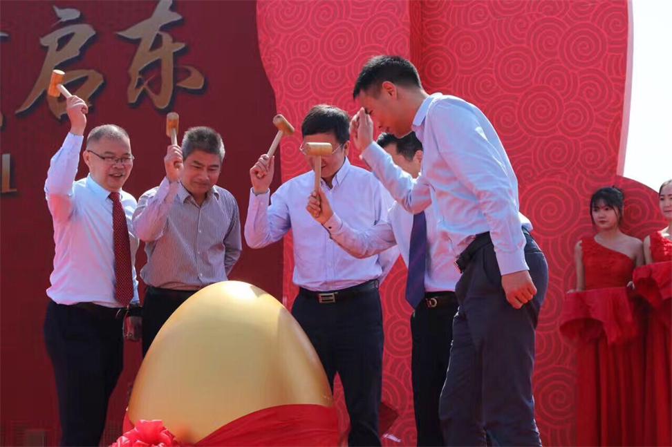 在主持人宣布奠基典礼正式启动后,新城控股集团副总裁陆建华、启东市新城万博房地产开发有限公司总经理沈兴明、启东市副市长高红宇、启东市汇龙镇党委书记朱卫忠共同举锤砸开金蛋,并进行培土生金仪式,在场各界嘉宾共同见证这一重要时刻。